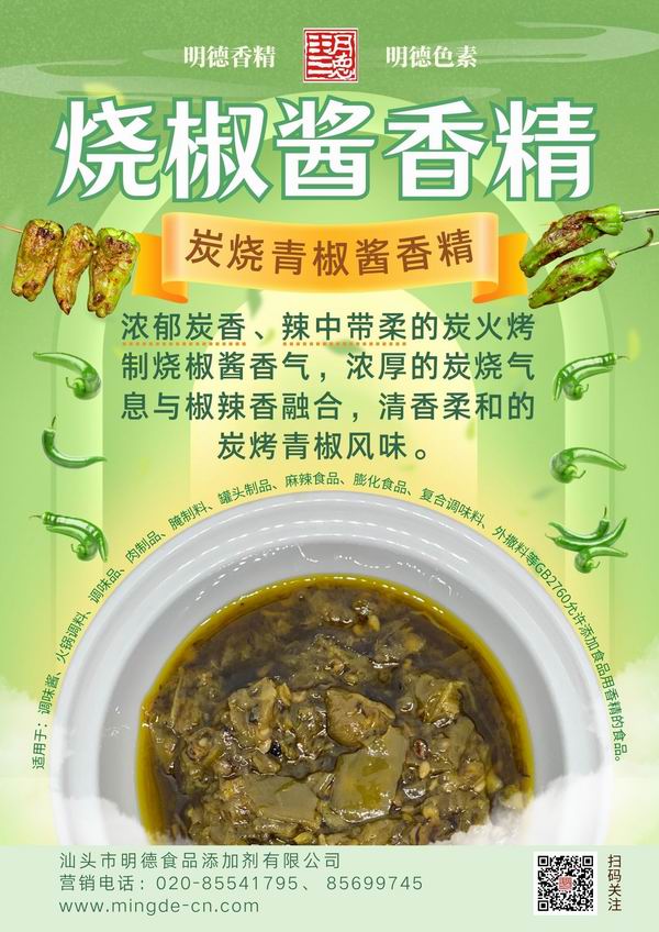 炭火烤制燒椒醬風味 應用于拌飯醬、辣醬中,炭烤香與青椒辣椒香結合,辣中帶柔,清香柔和,醬香十足,香氣撲鼻。明德 燒椒醬香精 耐溫性好、適用性廣、融合度高、香味醇厚。產品參數(shù)