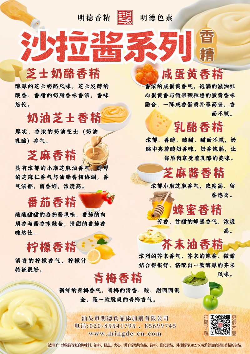 明德沙拉醬系列香精 多樣沙拉醬風(fēng)味 適配多類食品工廠汕頭市明德食品添加劑有限公司推出的沙拉醬系列香精,涵蓋芝士、蛋黃、芝麻、果蔬及特色風(fēng)味,適用于調(diào)味醬、焙烤制品、休閑食品等多個工業(yè)應(yīng)用場景,助力B端工廠實現(xiàn)風(fēng)味的穩(wěn)定性與差異化,讓產(chǎn)品在市場中脫穎而出。