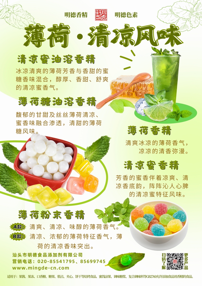 明德薄荷清涼風(fēng)味香精 清涼薄荷 覆蓋糖果飲品場景汕頭市明德食品添加劑有限公司推出的薄荷·清涼風(fēng)味香精系列,涵蓋清涼蜜油溶香精、薄荷糖油溶香精、薄荷香精、清涼蜜香精、薄荷粉末香精等多種調(diào)性。產(chǎn)品清涼舒爽、香氣真實,適用于糖果、飲料、口香糖、烘焙食品及復(fù)合調(diào)味等B端應(yīng)用,幫助工廠快速打造沁人心脾的清涼薄荷風(fēng)味。